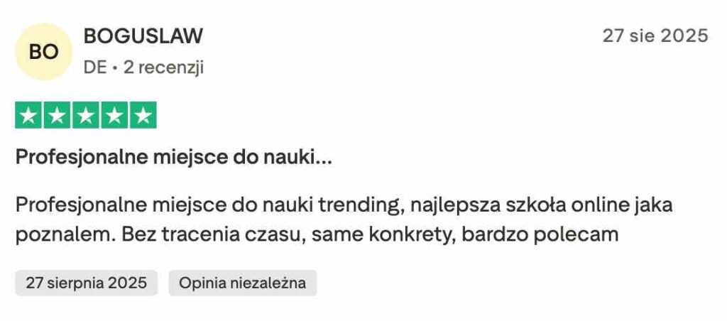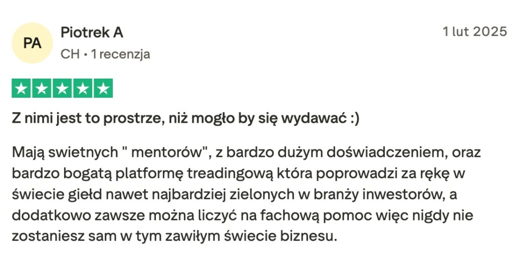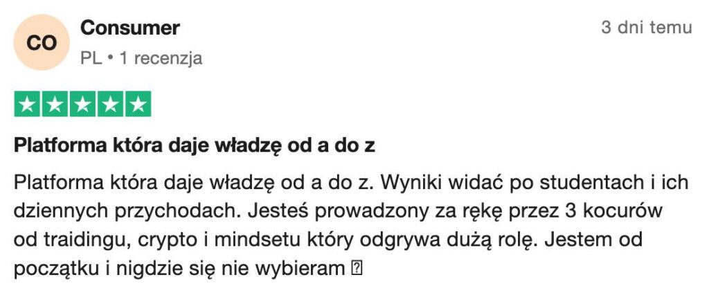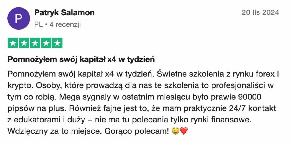 Nie, na naszej platformie nie ma takiej możliwości. To nie jest program poleceń ani MLM. Skupiamy się wyłącznie na edukacji w zakresie tradingu. Uczysz się od ekspertów, masz dostęp do live’ów na żywo, analiz rynkowych w czasie rzeczywistym oraz pełną Akademię Tradera, która pomoże Ci rozwijać umiejętności handlowe.